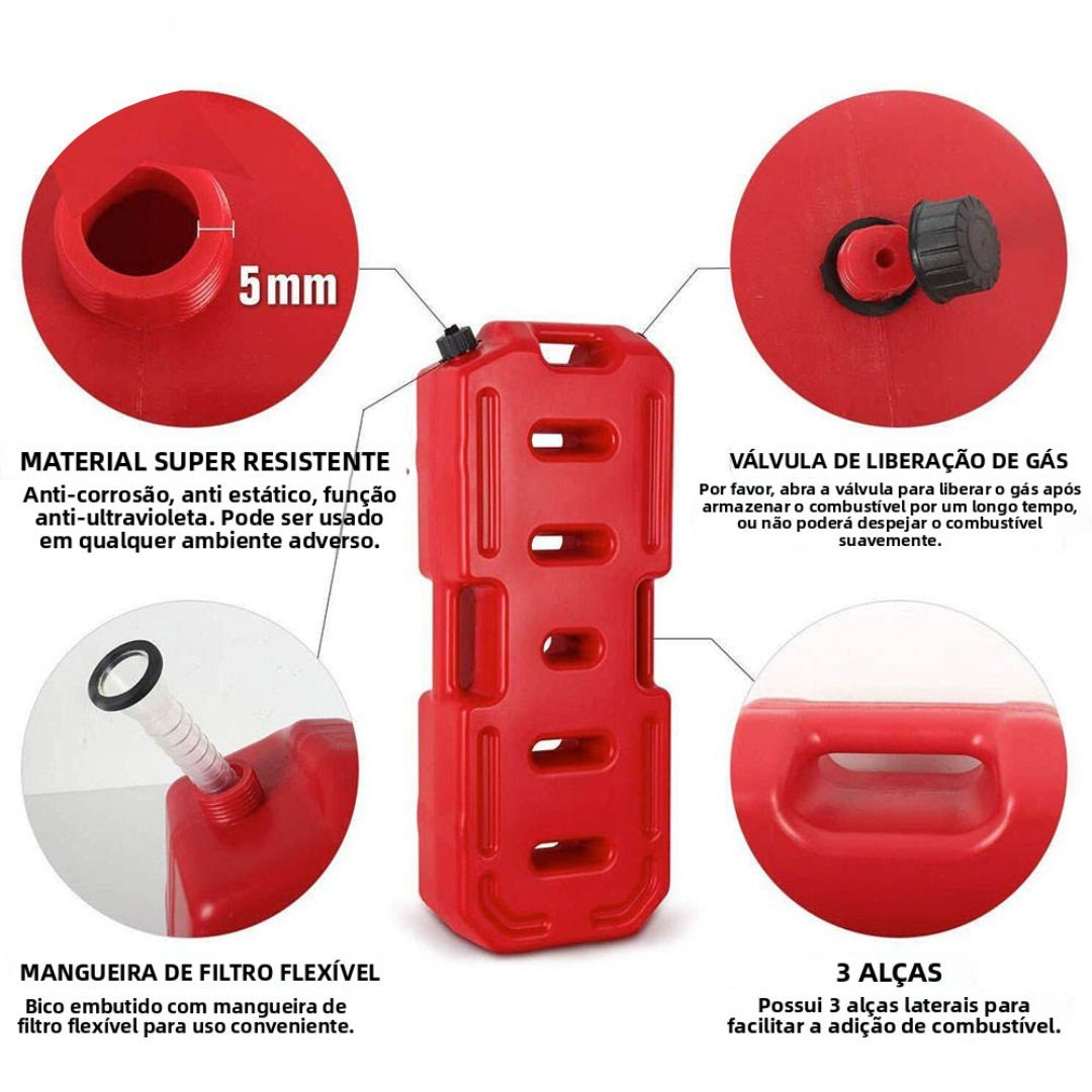Capacidade: Projetado para armazenar até 5L de combustível, ideal para emergências e viagens.